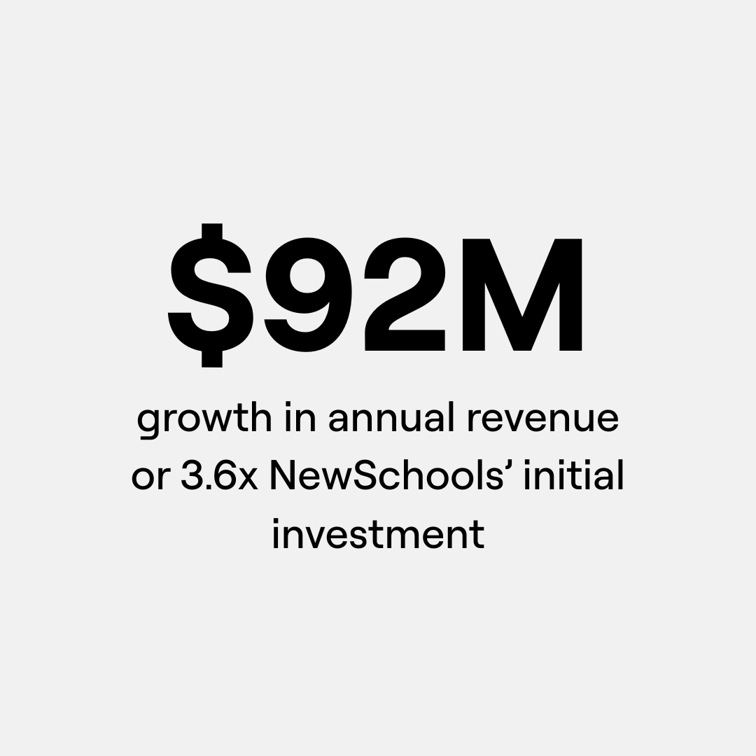 In addition to financial support, NewSchools provides comprehensive and customized management assistance that empowers ventures to thrive. As a result, ventures have grown their organizations, reach, and impact.