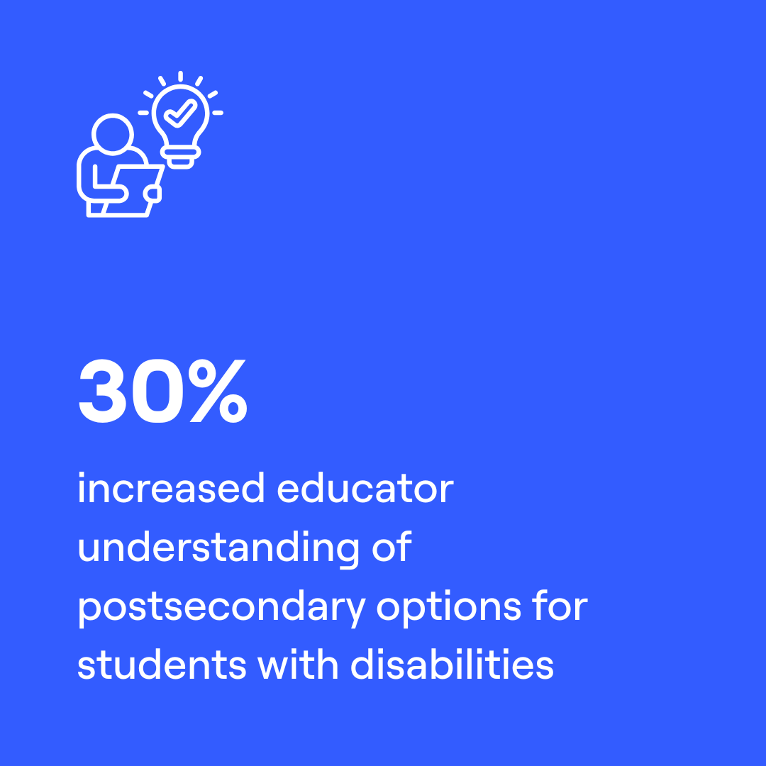 Through AI-powered planning tools and counselor trainings, Uprooted Academy is expanding educators’ understanding of college access, accommodations, and transition supports. Early pilots show clear gains: educator understanding of postsecondary options for students with disabilities increased, and more students completed college applications with targeted support.